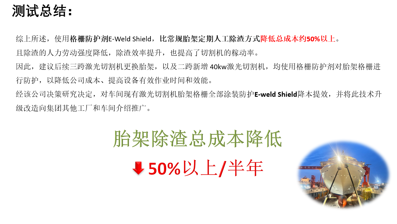 某造船企业应用案例:5000平方米生产车间全面应用后,每月除渣工时减少60-70%,半年格栅除渣费用降低50%,生产停工时间及格栅更换成本更是大大节省。